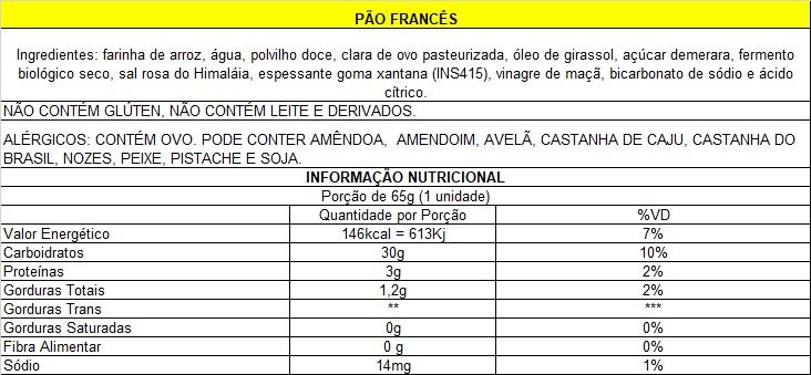 Ingredientes: farinha de arroz, água, polvilho doce, clara de ovo pasteurizada, óleo de girassol, açúcar demerara, fermento biológico seco, sal rosa do Himaláia, espessante goma xantana (INS415), vinagre de maçã, bicarbonato de sódio e ácido cítrico. NÃO CONTÉM GLÚTEN, NÃO CONTÉM LEITE E DERIVADOS. ALÉRGICOS: CONTÉM OVO. PODE CONTER TRAÇOS DE AMÊNDOA, AVELÃ, CASTANHA DE CAJU, CASTANHA DO BRASIL, NOZES, PEIXE, PISTACHE E SOJA.